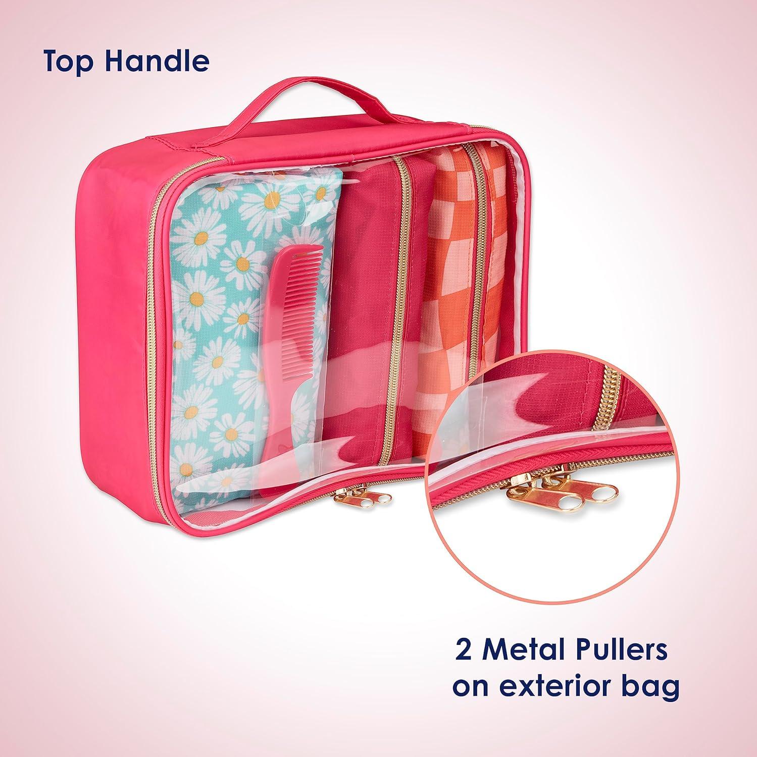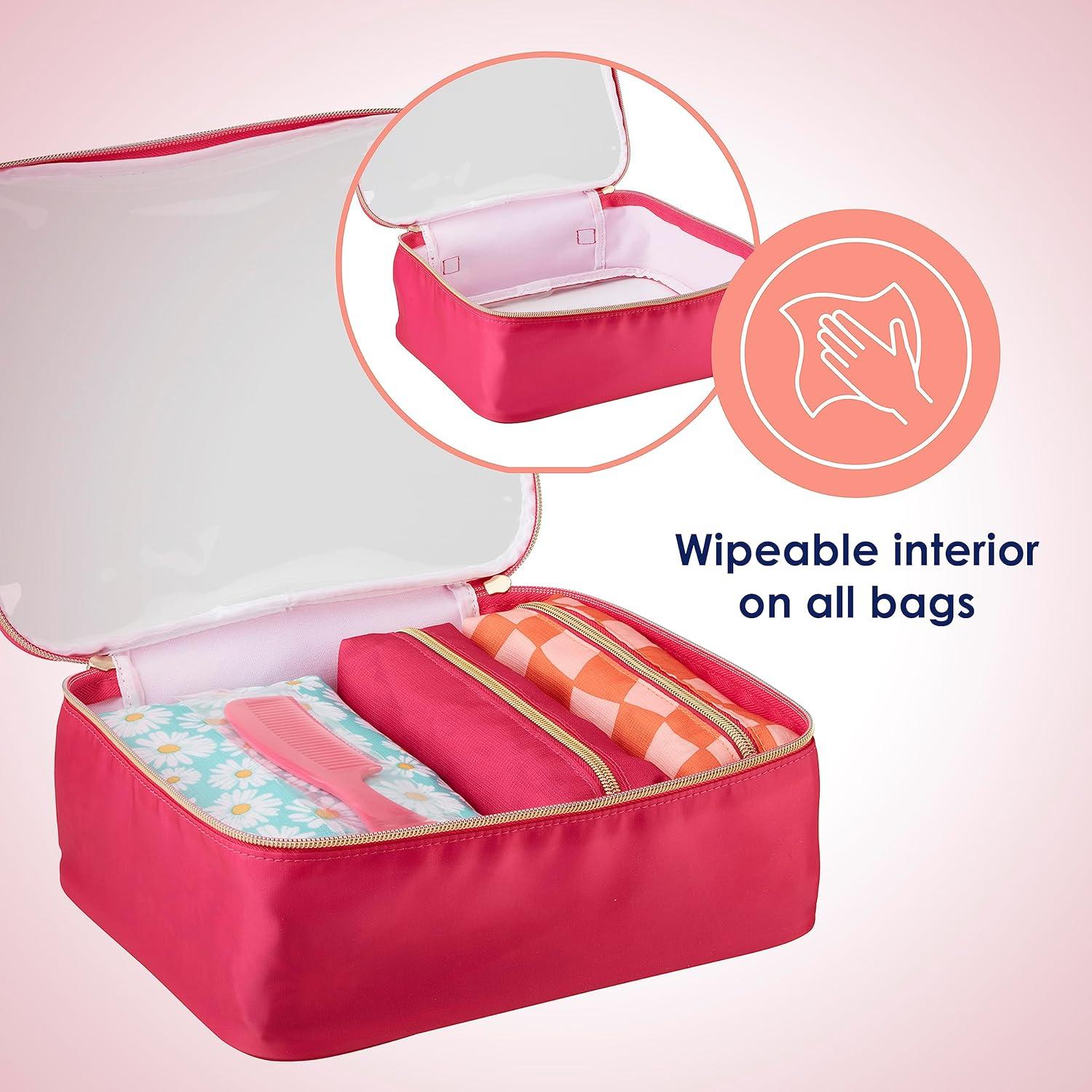 GOLD-TONE METAL COIL ZIPPER – The gold-tone metal coil zipper and hardware add a touch of bling, making this set perfect for getaways or keeping organized at home