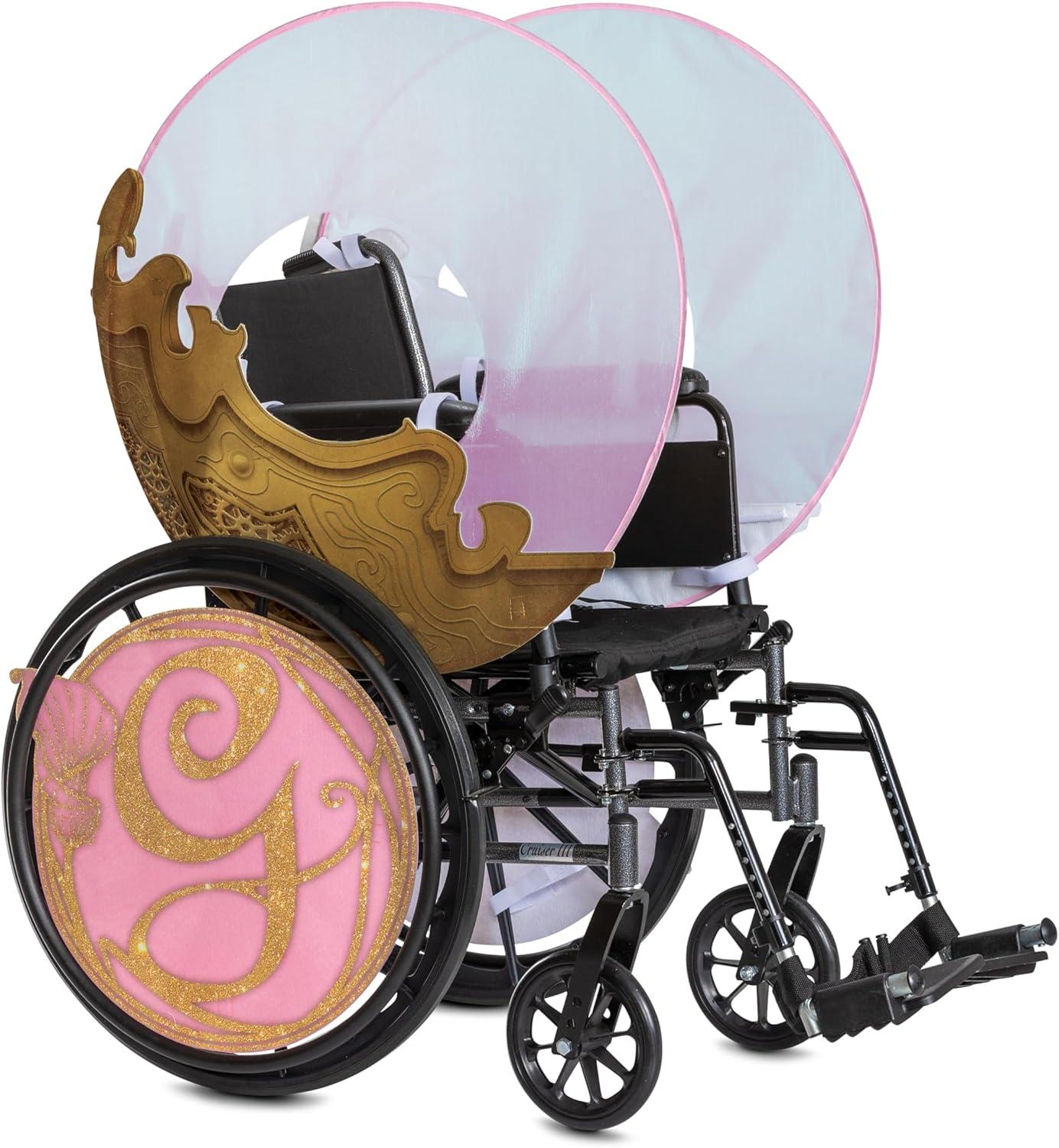 Transform any wheelchair into a magical ride with this officially licensed Glinda Wheelchair Cover Kit from Wicked, the movie! Inspired by Glinda’s enchanting bubble carriage, this delightful design brings a touch of sparkle and whimsy to your costume experience. The set includes two iridescent side panels shaped like shimmering bubbles, along with two pink felt wheel covers featuring printed glittery gold scrollwork and a stylized “G” emblem. Carriage rail accents and four support bars (two medium and two large) help secure the pieces in place. Whether heading to a costume party, play, or Halloween, this accessory is sure to make your entrance spellbinding. (Wheelchair not included. Costume, tiara, and wand sold separately.) Includes Wheelchair Covers, Cover Wheels & Six (6) Crossbar Supports