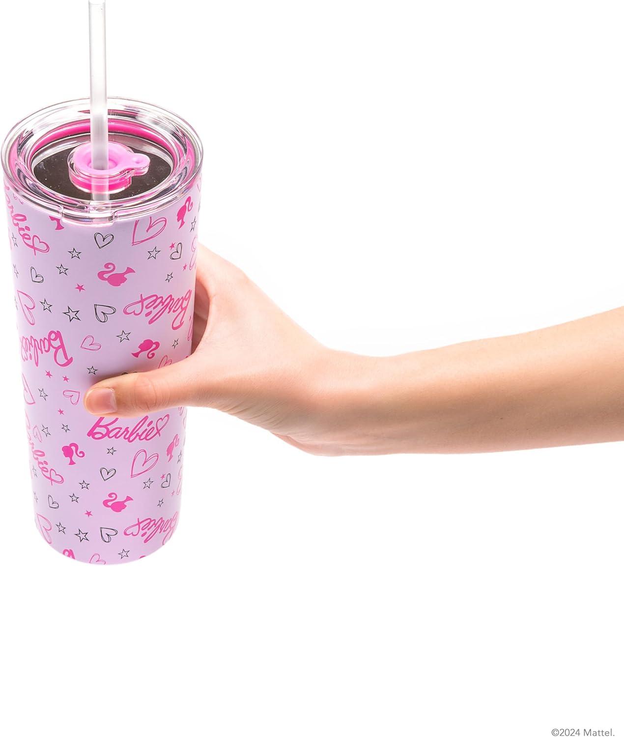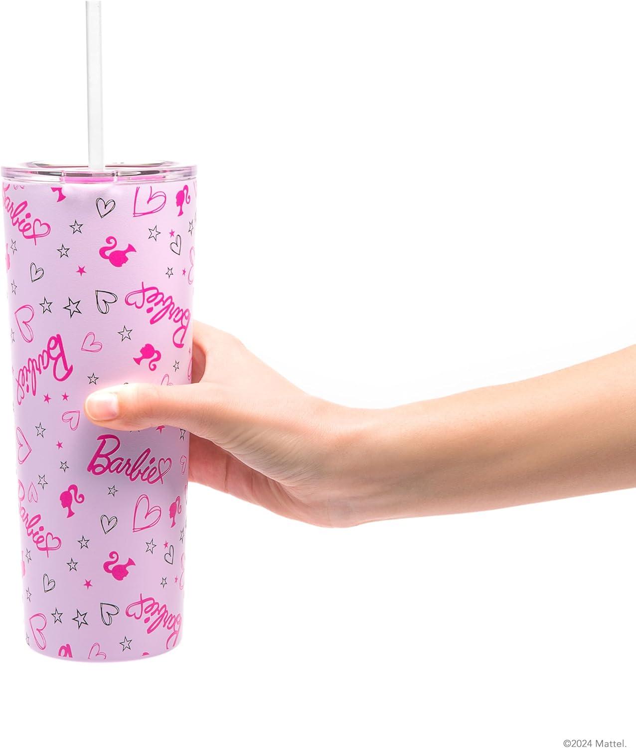 Dragon Glassware x Barbie Vacuum Insulated Tumbler with Lid and Straw – 24 oz Tumbler Cup with 2 Straws – Stainless Steel Tumbler with Straw for Water, Iced Tea – Travel Coffee Tumbler – Love Out Loud(Barbie – Classic)