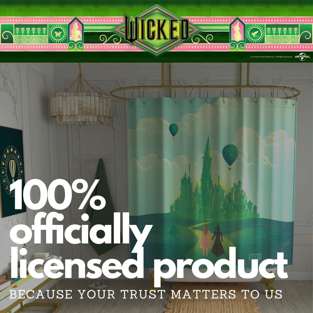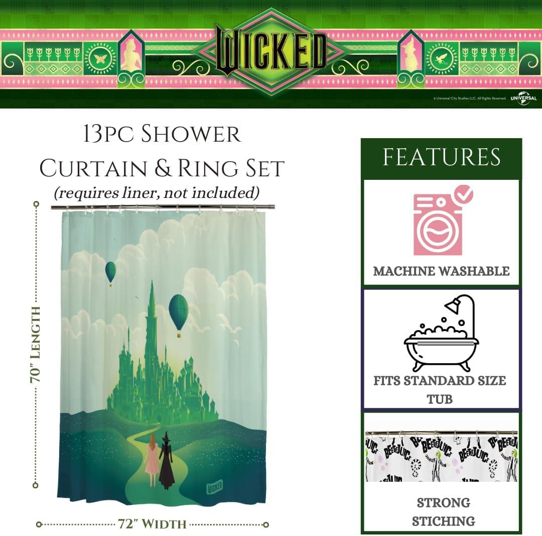 Step into the enchanting world of Wicked every time you enter your bathroom with the “Road to Oz” shower curtain set. This 13-piece set includes a beautifully designed microfiber shower curtain featuring the iconic Emerald City, along with matching shower rings to complete the look. Measuring 70×72 inches, this curtain provides full coverage for most standard-sized showers and tubs, making it both a functional and decorative addition to your space. Crafted from high-quality microfiber, the curtain is not only soft to the touch but also durable and easy to care for. The vibrant, officially licensed design brings a touch of Oz-inspired magic to your bathroom, creating an immersive experience that fans of Wicked will adore. Whether you're updating your bathroom décor or looking for the perfect gift for a Wicked enthusiast, this shower curtain set is a must-have. Elevate your space with the “Road to Oz” set and make every shower a journey into the magical world of Oz.