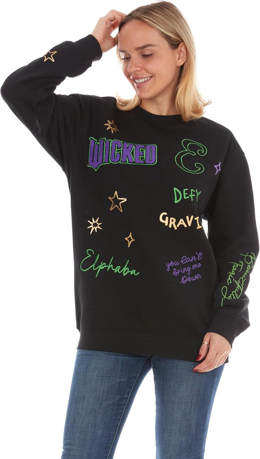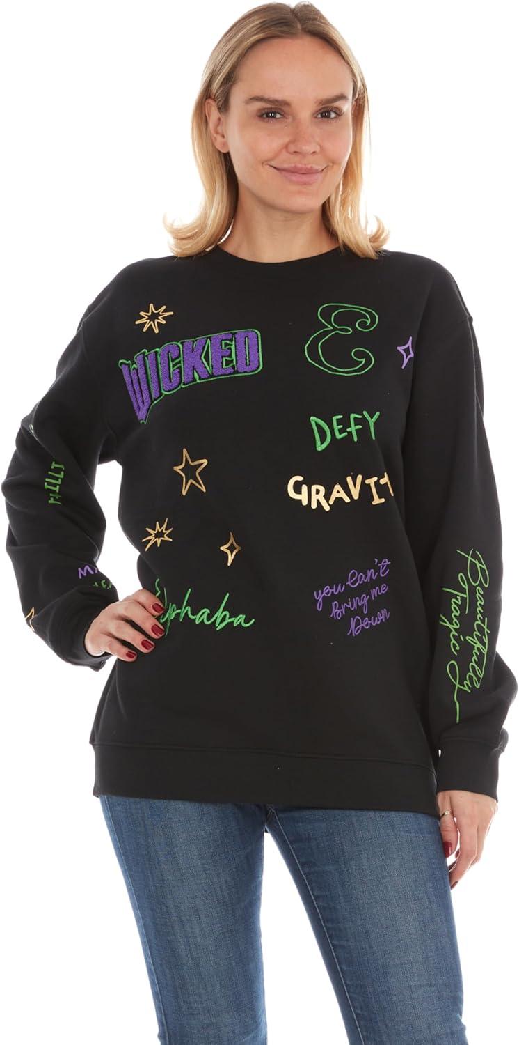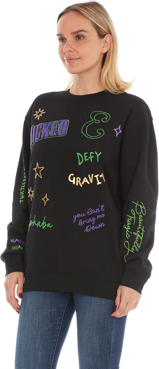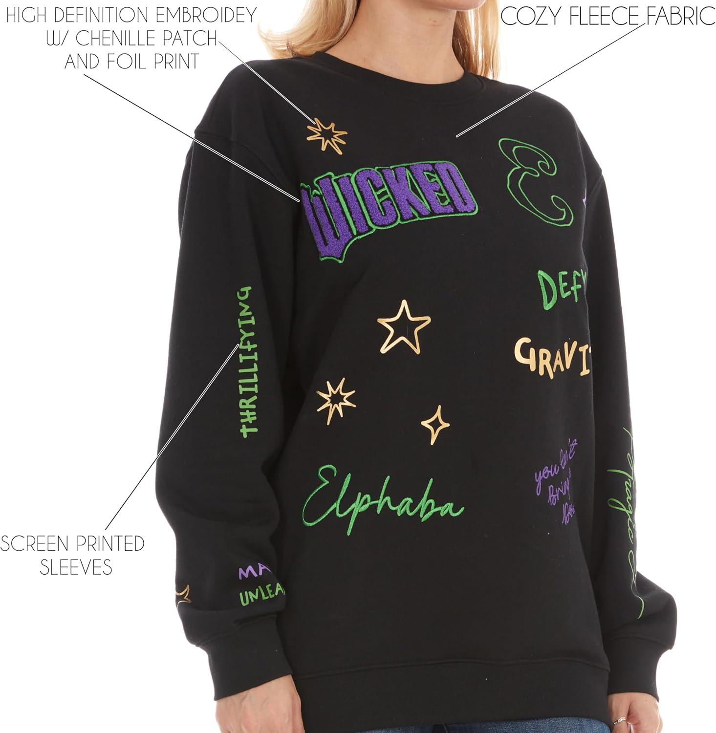 Wicked Glinda & Elphaba Women’s, Ladies & Juniors Crewneck Sweatshirt with Embroidery & Chenille, Sleeve & Back Graphics(Black)
