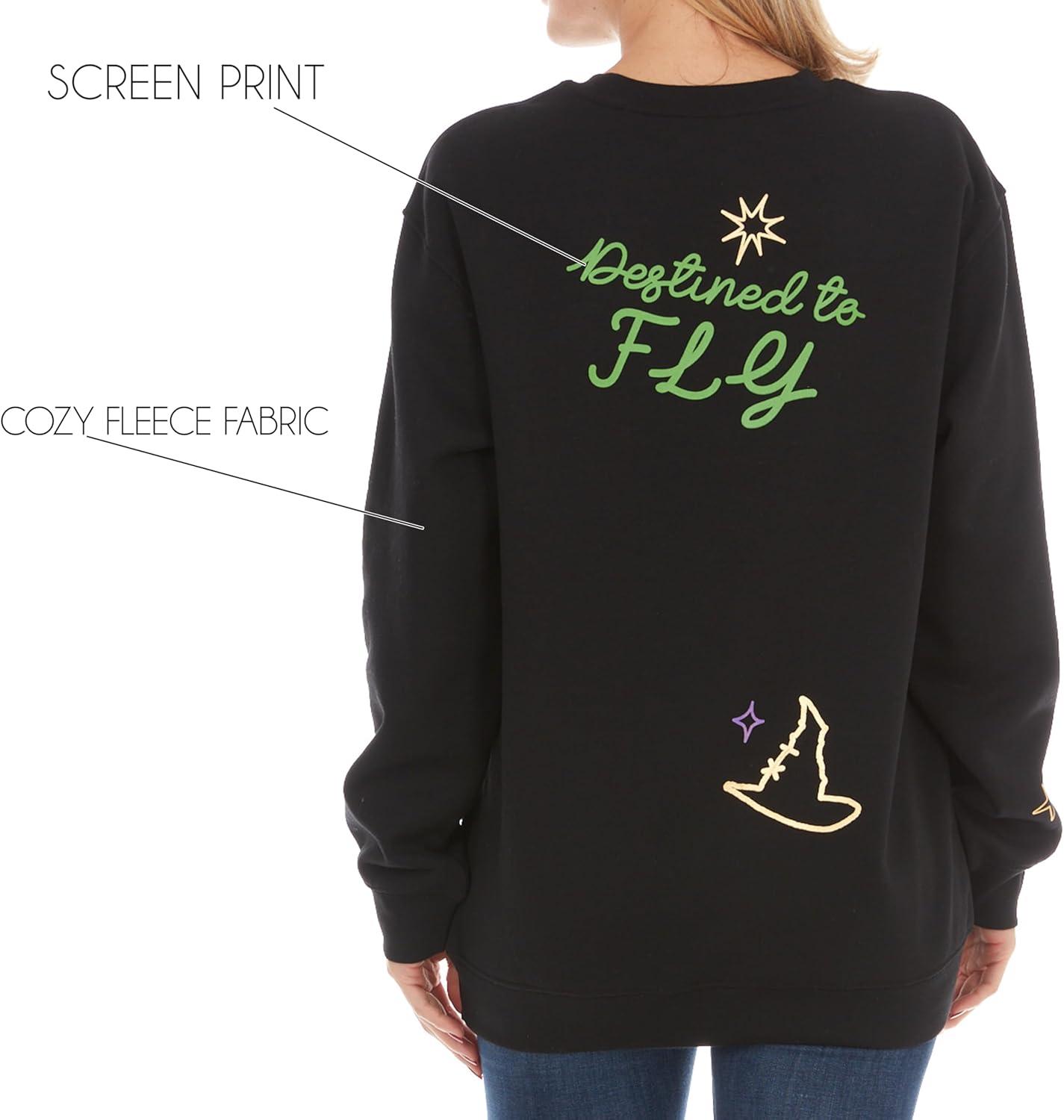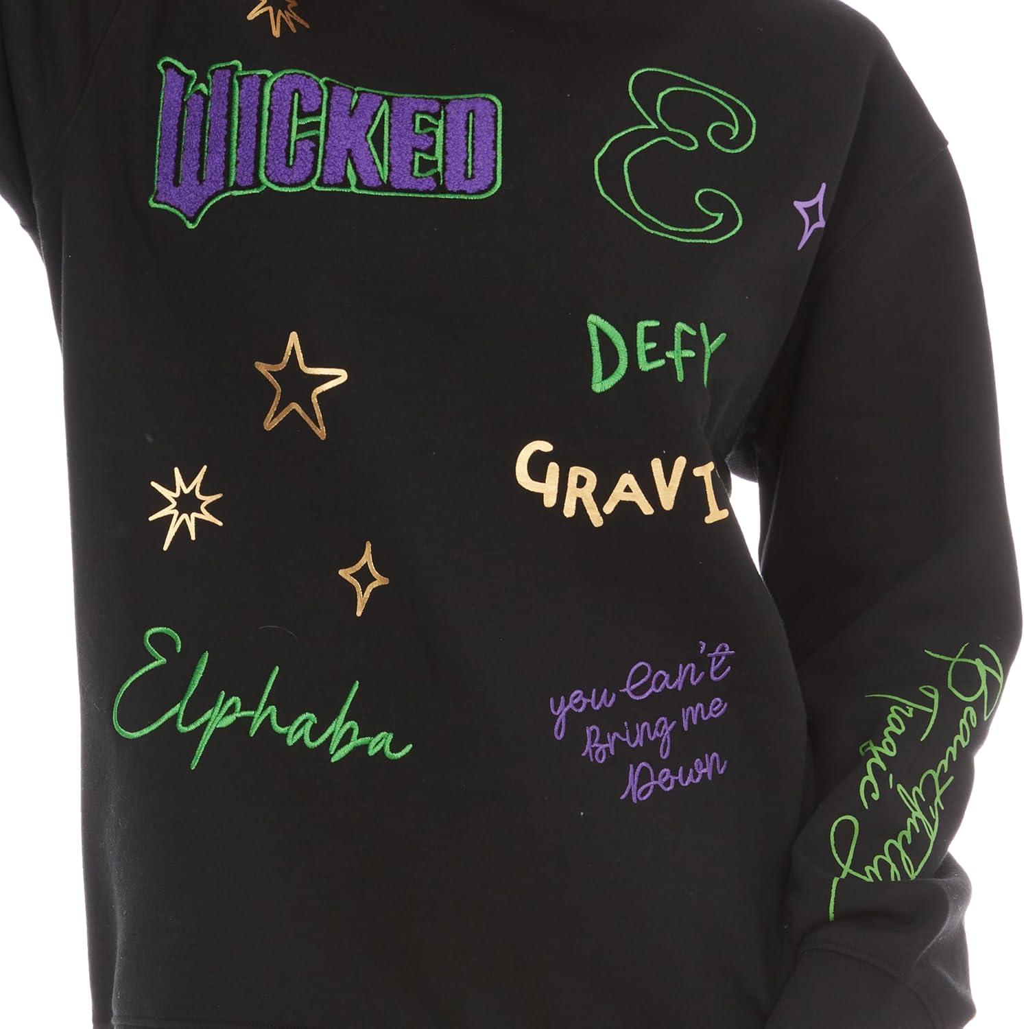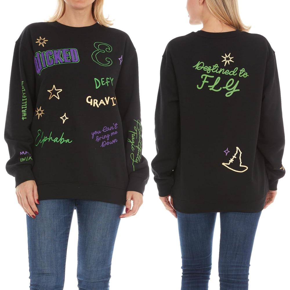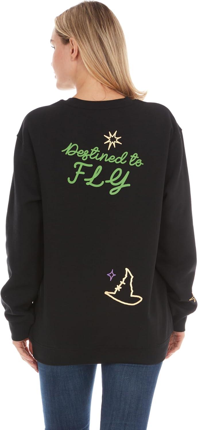 Wicked Glinda & Elphaba Women’s, Ladies & Juniors Crewneck Sweatshirt with Embroidery & Chenille, Sleeve & Back Graphics(Black)