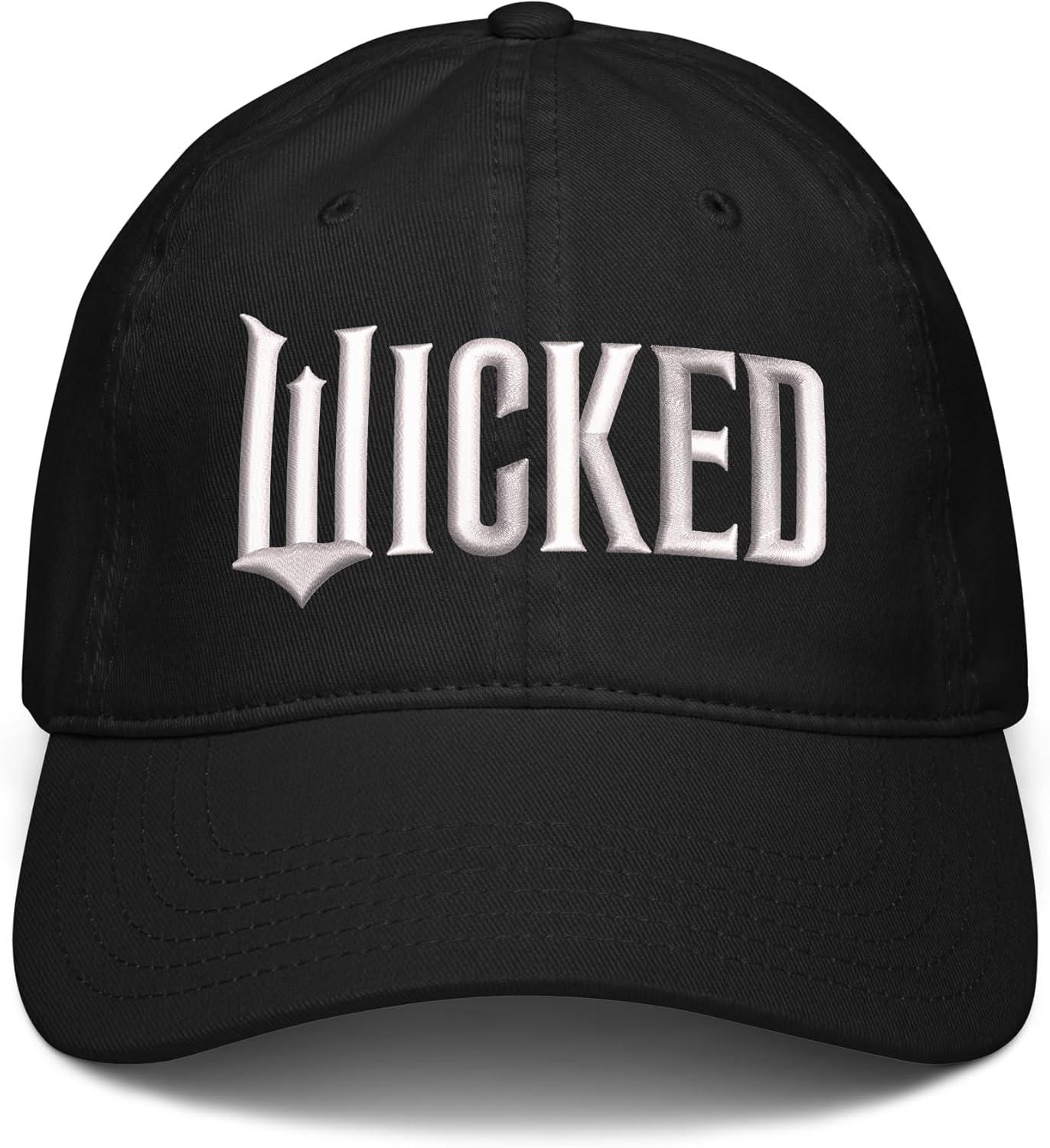 Movie merchandise design. Experience the magic of Wicked with this Wicked movie logo hat. Top off your look with a hint of magic! Our Wicked hats bring a touch of Oz to your style with this Wicked hat featuring the signature logo in white. Wicked is the untold story of the witches of Oz. Elphaba, a young woman, misunderstood because of her unusual green skin, who has yet to discover her true power. Glinda, a popular young woman, gilded in privilege and ambition, who has yet to discover her true heart. The two meet as students at Shiz University in the fantastical Land of Oz and forge an unlikely but profound friendship. Following an encounter with The Wonderful Wizard of Oz, their friendship reaches a crossroads, and their lives take very different paths. Glinda's unflinching desire for popularity sees her seduced by power, while Elphaba's determination to remain true to herself, and to those around her, will have unexpected and shocking consequences for her future. Their extraordinary adventures in Oz will ultimately see them fulfill their destinies as Glinda the Good and the Wicked Witch of the West. To unleash more Wicked styles, fly over to the official Wicked Amazon page and discover T-shirts, tanks, V-necks, raglans, sweatshirts, hoodies, zip hoodies, throw pillows, cellphone grips, cellphone grip wallets, phone cases, Tumblers, totes, and more.