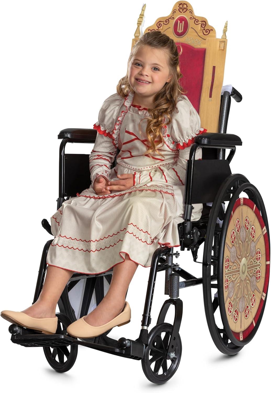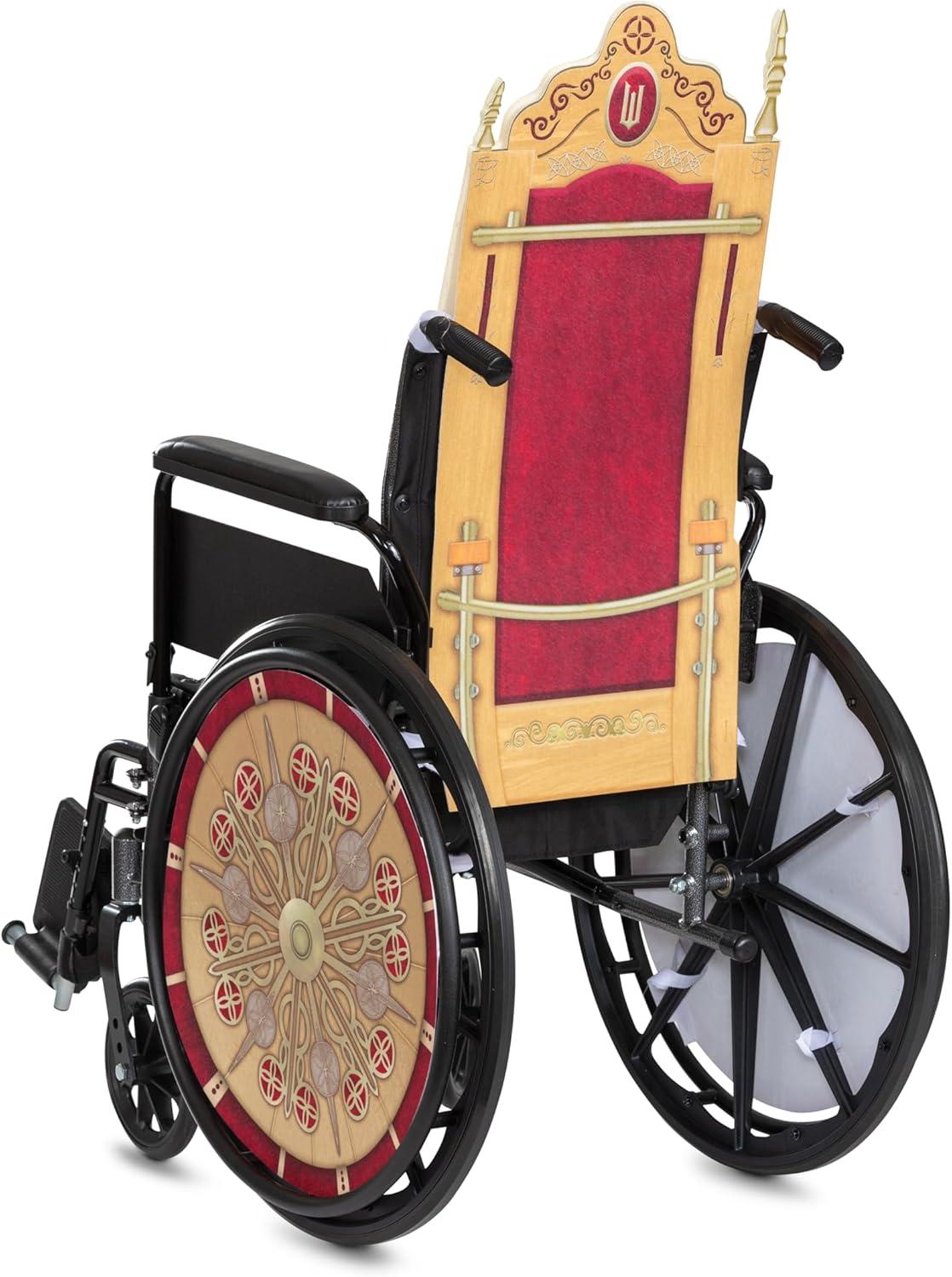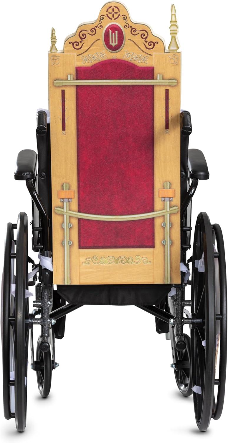 Transform any wheelchair into a regal ride with this officially licensed Nessarose Wheelchair Cover Kit from Wicked. Inspired by Nessarose’s chair from the Land of Oz, this adaptive accessory kit includes four printed felt panels with detailed throne and wheel art, along with six support bars (four extra-large, two extra-small) for added structure. The pieces feature adjustable hook and loop closure straps for easy attachment to most standard wheelchairs, offering both flexibility and comfort. Whether for Halloween, a stage performance, or a magical dress-up day, this enchanting accessory turns any moment into a scene straight out of Shiz University. Costume sold separately. Wheelchair not included. Includes Wheelchair Covers, Cover Wheels & Six (6) Crossbar Supports
