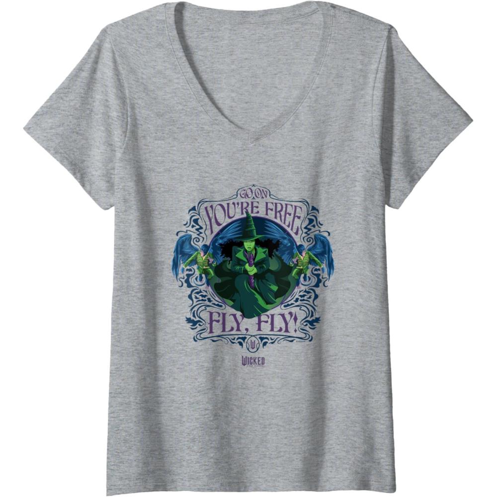 Womens Wicked: For Good Elphaba You’re Free Fly V-Neck T-Shirt(Heather Grey)