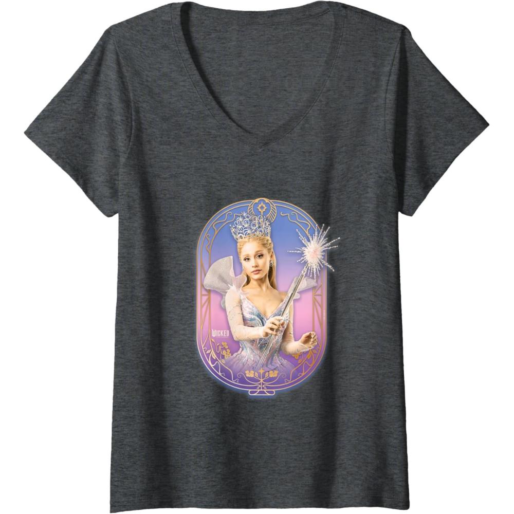 Womens Wicked: For Good Glinda Sparkling Wand V-Neck T-Shirt(Dark Heather Grey)