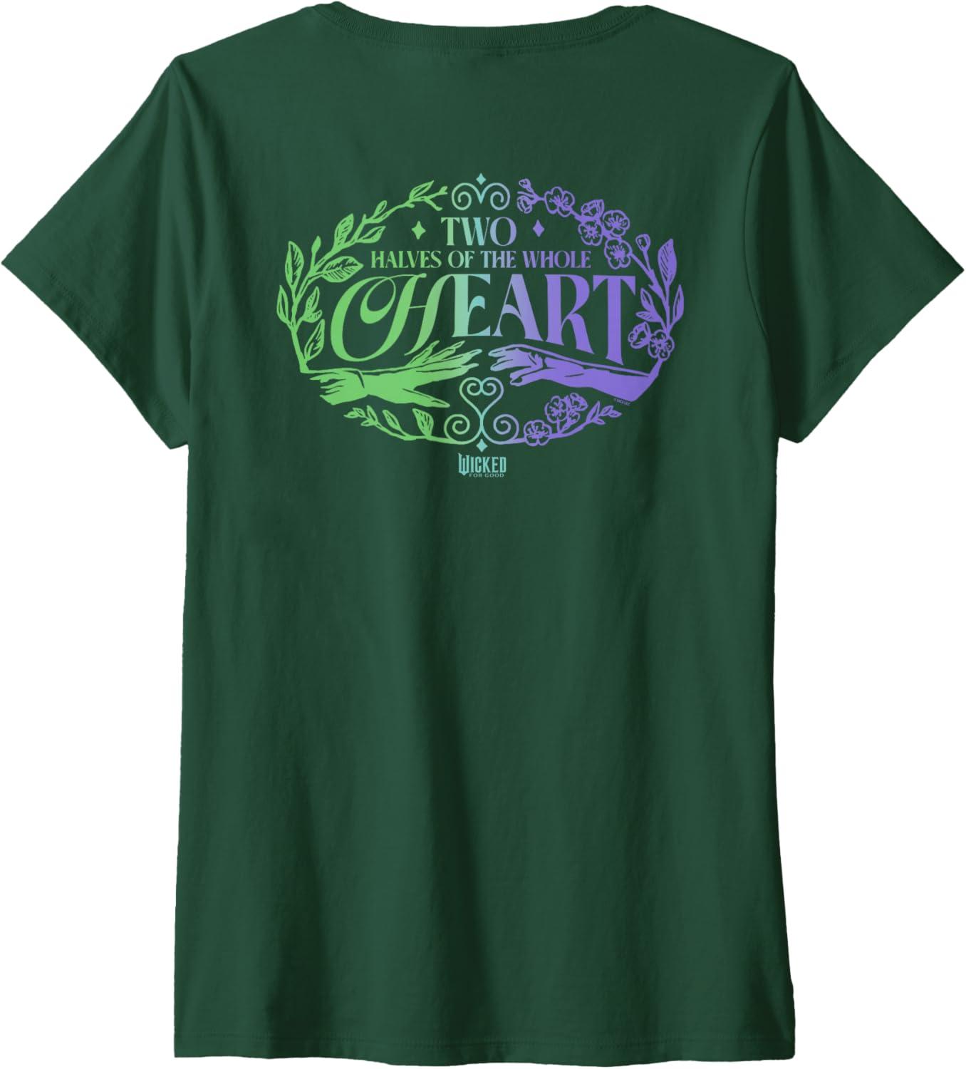 Womens Wicked: For Good Two Halves of the Whole Heart Front & Back V-Neck T-Shirt(Dark Green)