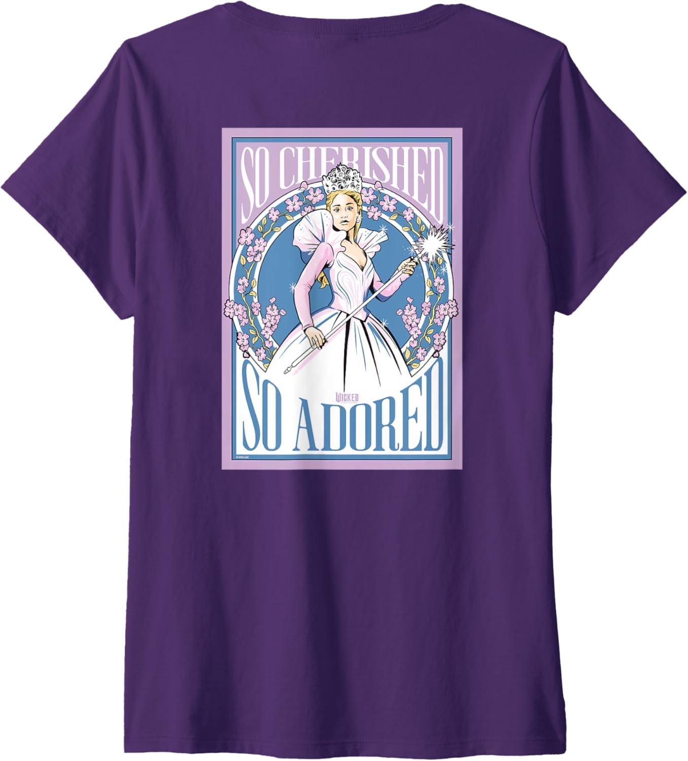 Step into the sparkling world of Oz with this enchanting Wicked: For Good design. The front features a delicate circle pocket hit adorned with magical sparks and the heartfelt phrase “We believe in Glinda,” inviting you to share in her radiant light. On the back, Glinda stands regal and poised, wand in hand, crowned with grace, surrounded by the loving words “so cherished so adored.” This design captures Glinda’s charm, strength, and the warmth she brings to Oz’s magic. Perfect for fans who believe in hope, kindness, and the power of a truly unforgettable Good Witch. For more magical apparel and accessories, visit the official Wicked Amazon page and celebrate the magic of Glinda.